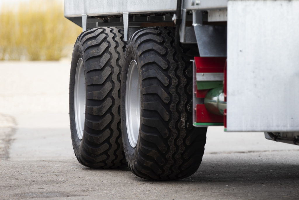 Wij bieden twee typen wielen aan voor onze wagen. Het eerste type wiel (10.0/75×15.3) wordt standaard op de wagen gemonteerd. Het tweede type wiel is de Vredestein flotation+ (te zien op de foto) . Met deze wielen wordt er een groter draagoppervlak gecreëerd wat zorgt voor beter verdeelde belasting op de ondergrond. De achterste as van de wagen is breder. Hiermee wordt spoorvorming voorkomen. Met de Vredestein Flotation banden kan de achterste band omgedraaid worden waardoor de wielen in lijn komen.